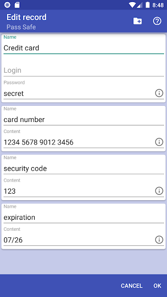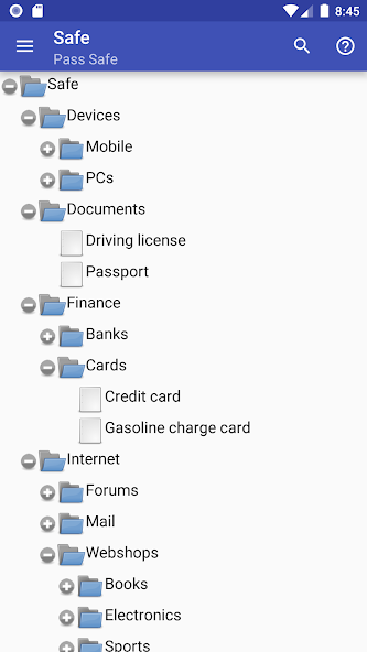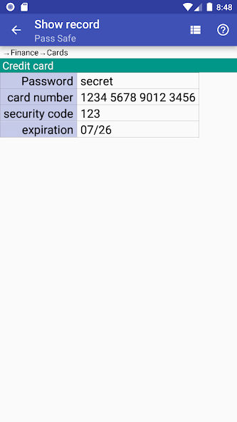 모든 암호, 사용자 이름, 계정, 계정 번호, 고객 ID, 보안 코드, 식별자, 핀을 기억하는 데 어려움이 있습니까? Pass Safe 모든 암호, 사용자 이름, 계정 등을 저장하는 데 사용할 수 있습니다. 액세스하기 위해 알아야 할 것은 하나의 마스터 비밀번호입니다. 데이터는 장치에만 암호화 된 (AES-256 Cypher가 사용됨) 저장됩니다.