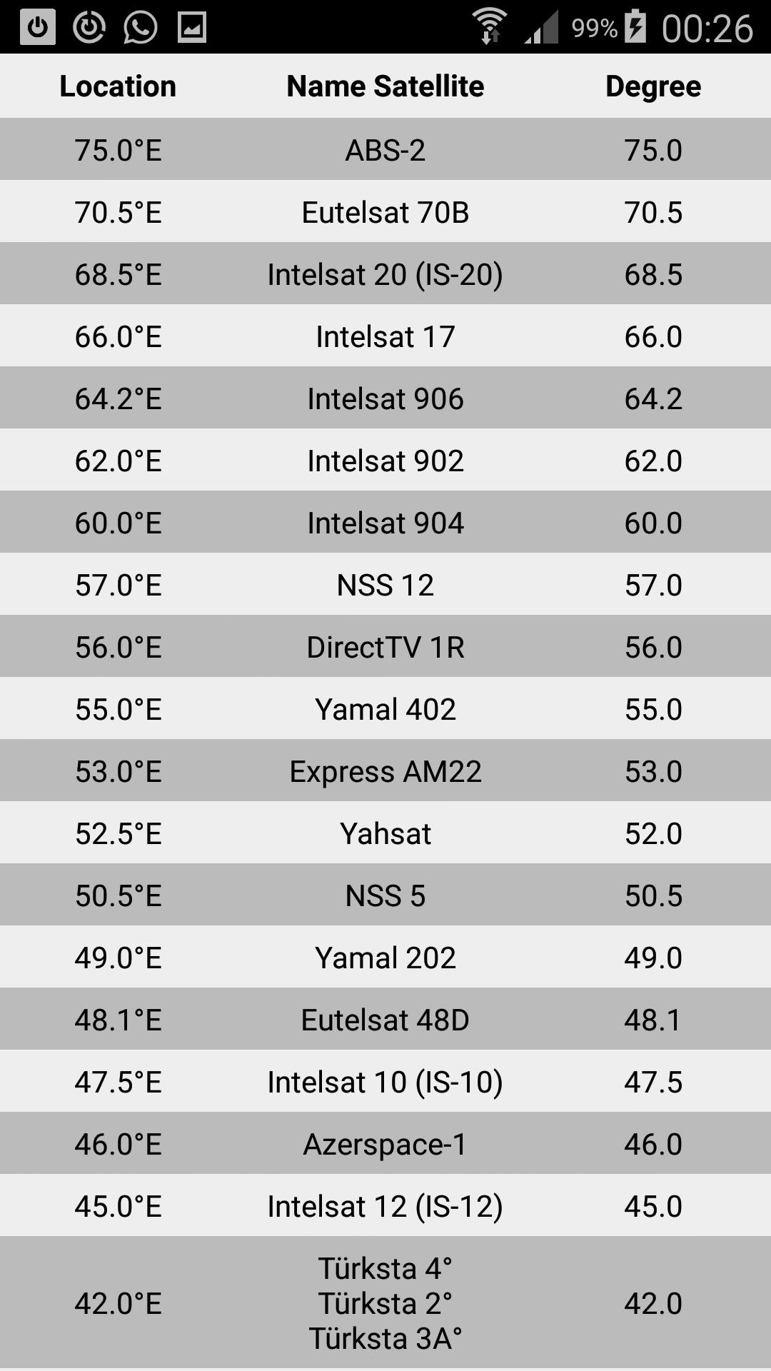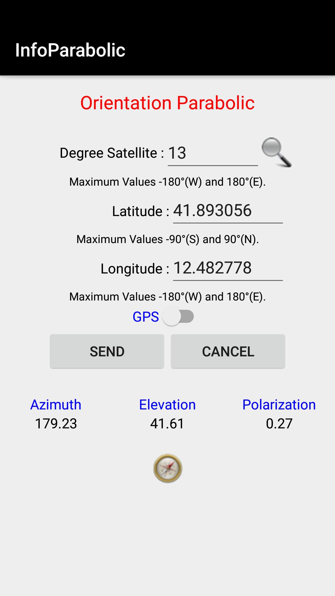 우선, 포물선 안테나를 가리키고 자하는 위성의 정도 (예 : 핫 버드 13 °)를 입력 한 다음, 당신이있는 위치의 좌표 (수동 또는 지리적 위치)를 입력하면 앱이 계산됩니다.