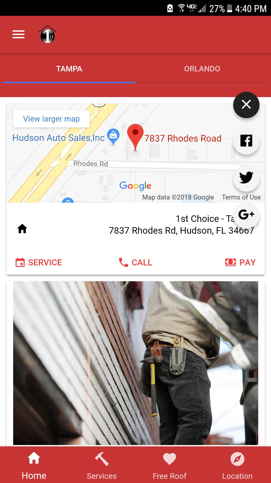 정보, 스케줄링, 스페셜 및 콘테스트를위한 주요 앱! 서비스 요청을 제출하거나 유지 보수 클럽에 등록 할 때 지붕 손상이있는 이미지를 업로드하십시오. 파이낸싱 및 진행중인 스페셜에 대한 정보는 Facebook 메신저를 사용하여 직원들과 쉽게 커뮤니케이션 할 수 있습니다. 게다가 훨씬 더!
