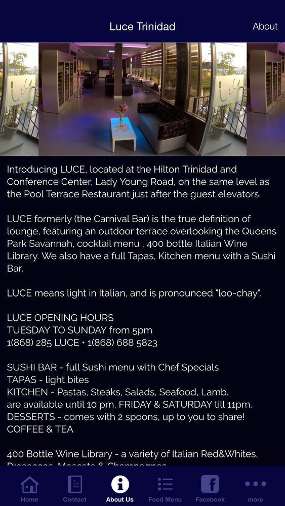 힐튼 트리니다드 앤 컨퍼런스 센터에 위치한 Luce (이전의 카니발 바)는 2015 년 3 월에 문을 열었습니다. 우리는 400 병 와인 라이브러리가있는 라운지의 진정한 정의, Queens Park Savannah, Tapas & Kitchen 메뉴가있는 야외 테라스가있는 라운지의 진정한 정의입니다.