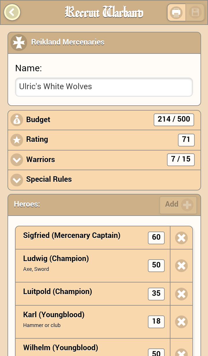 Warbands 로스터 시트를 장치에서 직접 인쇄하십시오.