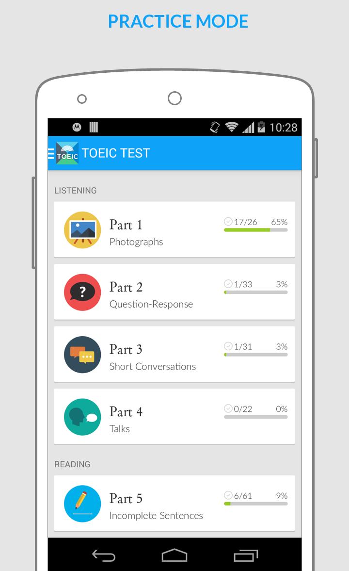 Toeic Listening and Reading에는 7 개의 부품 및 Toeic Real Test Mode가 포함됩니다.