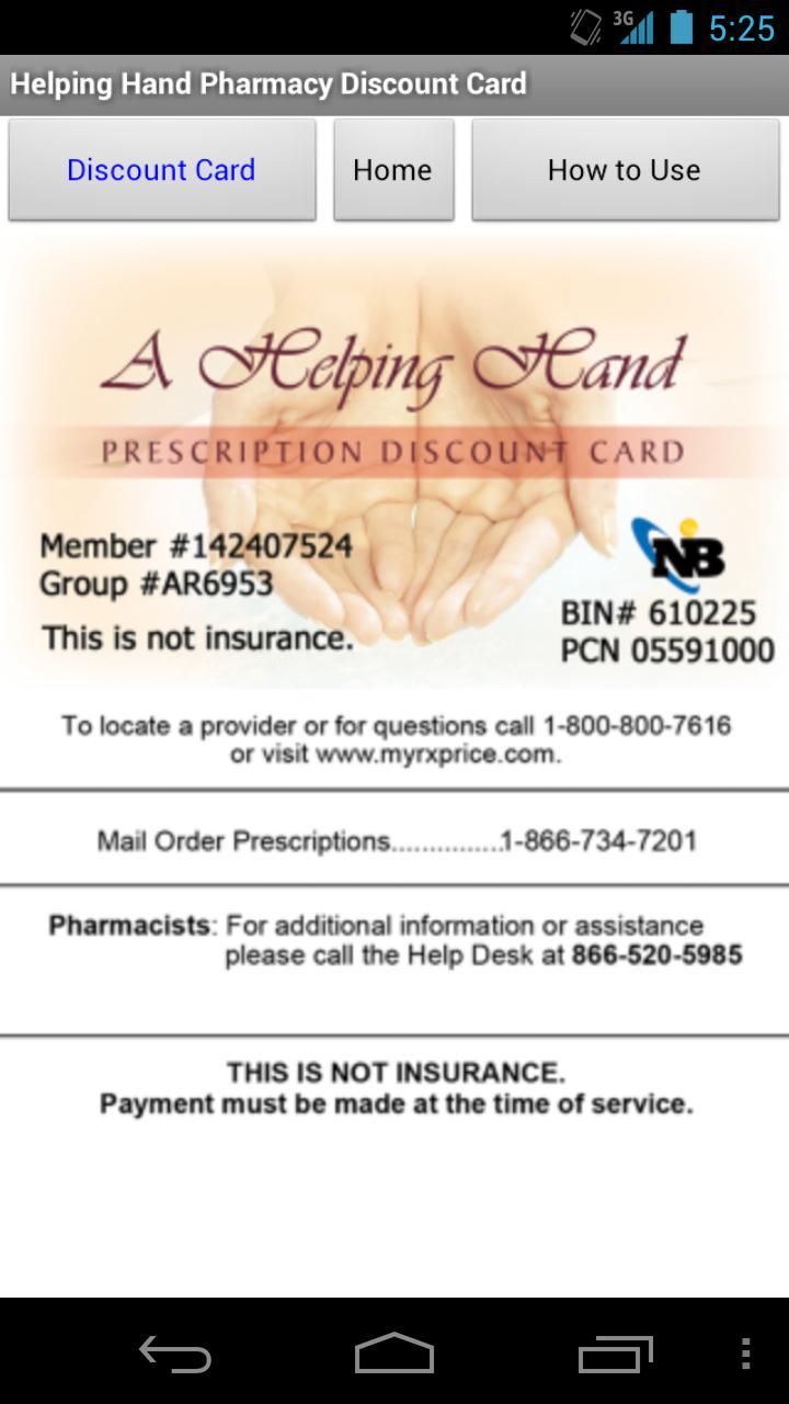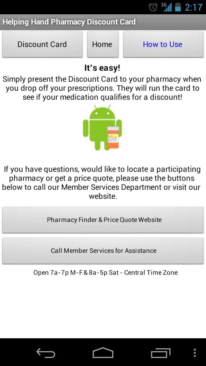 할인 카드에 대한 질문이 있거나 참여 약국을 찾거나 가격 견적을 받으려면 앱에는 회원 서비스 부서에 전화하거나 가격 책정 웹 사이트를 방문하는 버튼이 포함되어 있습니다.
