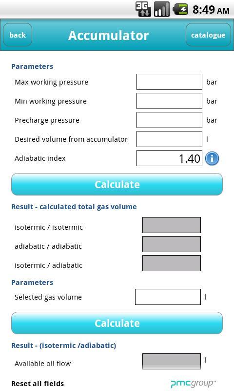 계산기에는 펌프, 모터, 실린더 및 축적기 계산이 포함되어 있습니다. 또한 배관 및 오리피스의 유체 속도 및 압력 감소에 대한 계산과 유압 시스템의 압력 감소로 인해 열 발생 계산이 포함됩니다. 유압 엔지니어링에 사용되는 가장 일반적인 장치의 장치 변환기도 포함되어 있습니다.