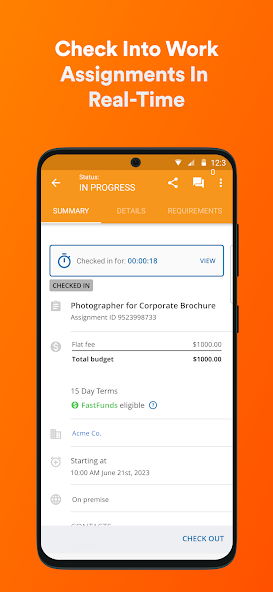 업무 관리 - 현장에서는 체크인하고 사진 및 문서와 같은 결과물을 업로드하고 체크 아웃 할 수 있습니다. 작업을 완료하면 WorkMarket 앱에서 승인 및 지불 (및 상환 요청)을 제출하십시오.