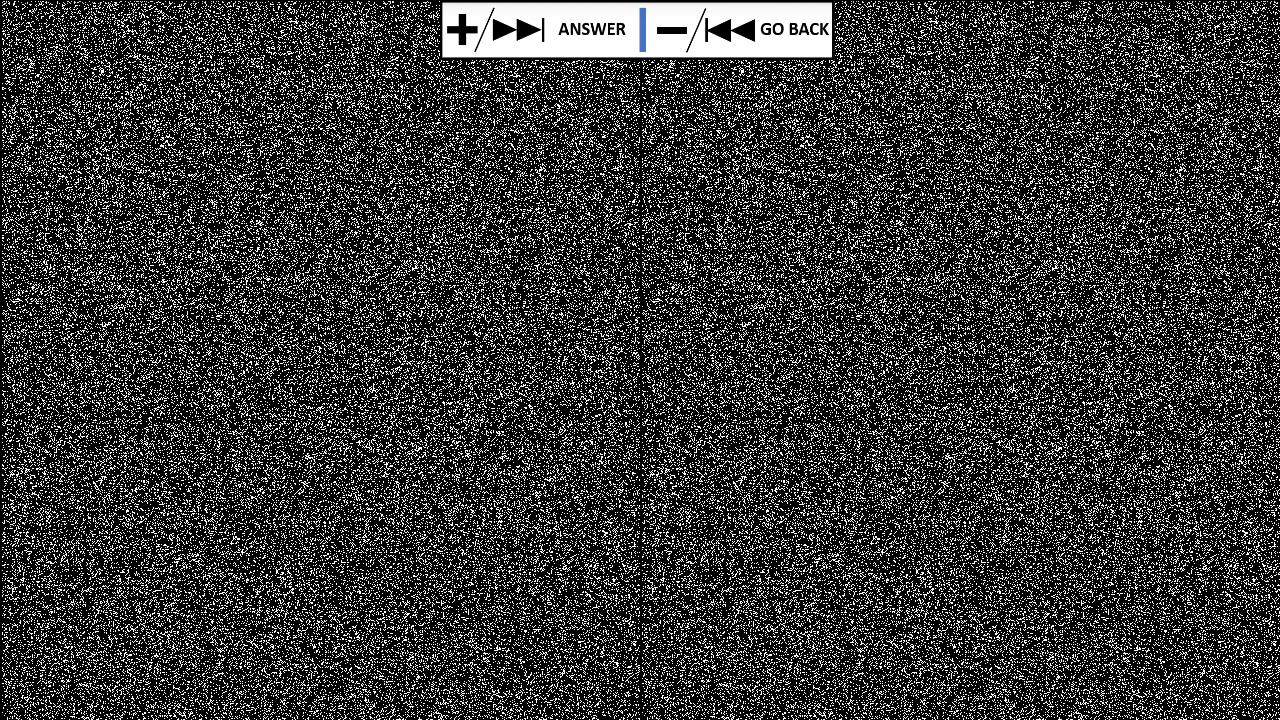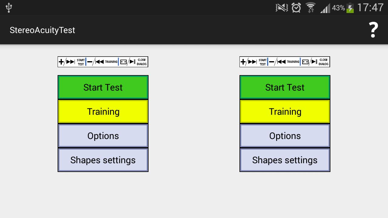 - 테스트 시작 (또는 + 볼륨 버튼) : 게으른 시력 검사를 시작합니다. 당신은 모양을 찾아야합니다 !! 대답하려면 + 볼륨 버튼을 누르고 +/- 볼륨 버튼을 눌러 솔루션을 선택하고 이어폰 홈 버튼을 사용하여 확인하십시오. 테스트를 완료하기로 결정하면 뒤로 버튼 ( 또는 볼륨 버튼)을 누르면 점수가 표시됩니다. 이어폰 홈 버튼을 눌러 대화 상자를 닫습니다.
