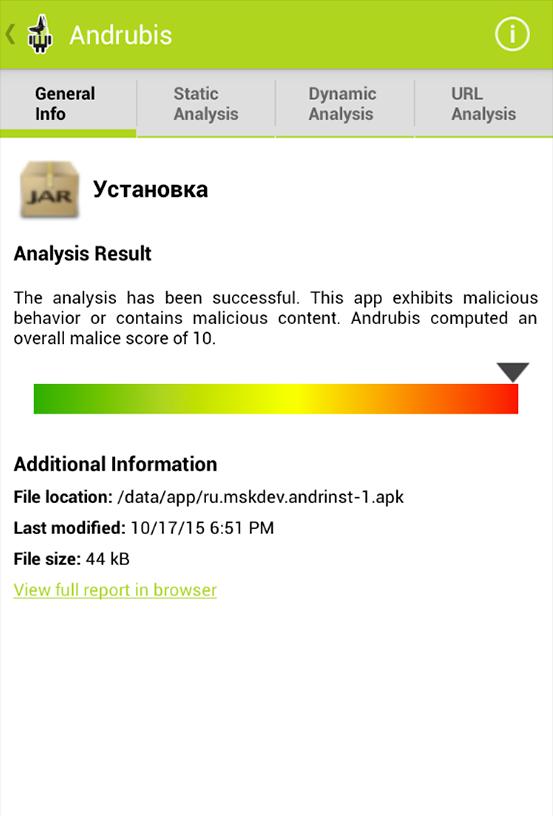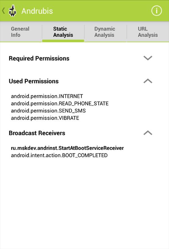 Andrubis 연구 프로토 타입이라는 점을 명심하십시오. 분석 결과, 위험 추정 및 행동 정보는 분석 환경에서 자동으로 생성되므로 정확하지는 않습니다. 저자는 부인 또는 악의적 인 오 분류 된 응용 프로그램으로 인한 피해에 대해 책임을지지 않습니다.