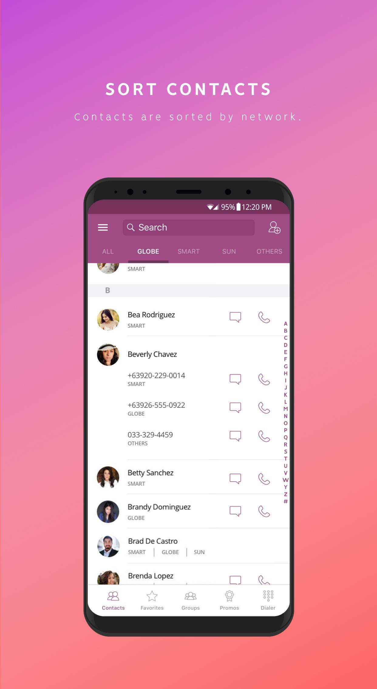 정렬 네트워크 - 네트워크별로 모든 연락처를 자동으로 식별하고 정렬합니다. 여러 숫자를 가진 친구는 지정된 네트워크와 한 번의 접촉하에 나타납니다.