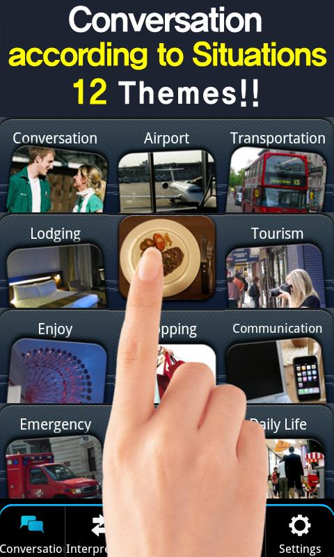 -이 앱에는 다양한 범주 및 컨텍스트 별 문장이 포함되어 있으므로 추가 자료 없이이 앱을 최대한 활용하여 다른 국가의 사람들과 의사 소통 할 수 있습니다 (문구 책, 사전 등).
