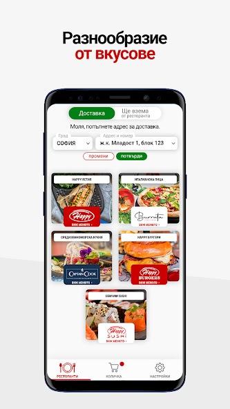 Happy의 모바일 응용 프로그램을 통해 Varna, Sofia, Burgas, Plovdiv 또는 Ruse에있는 식당에서 식사를 주문할 수 있습니다.