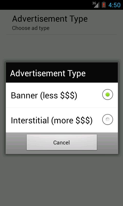 4. 표시 할 광고 유형을 선택하십시오 (배너 또는 간극).