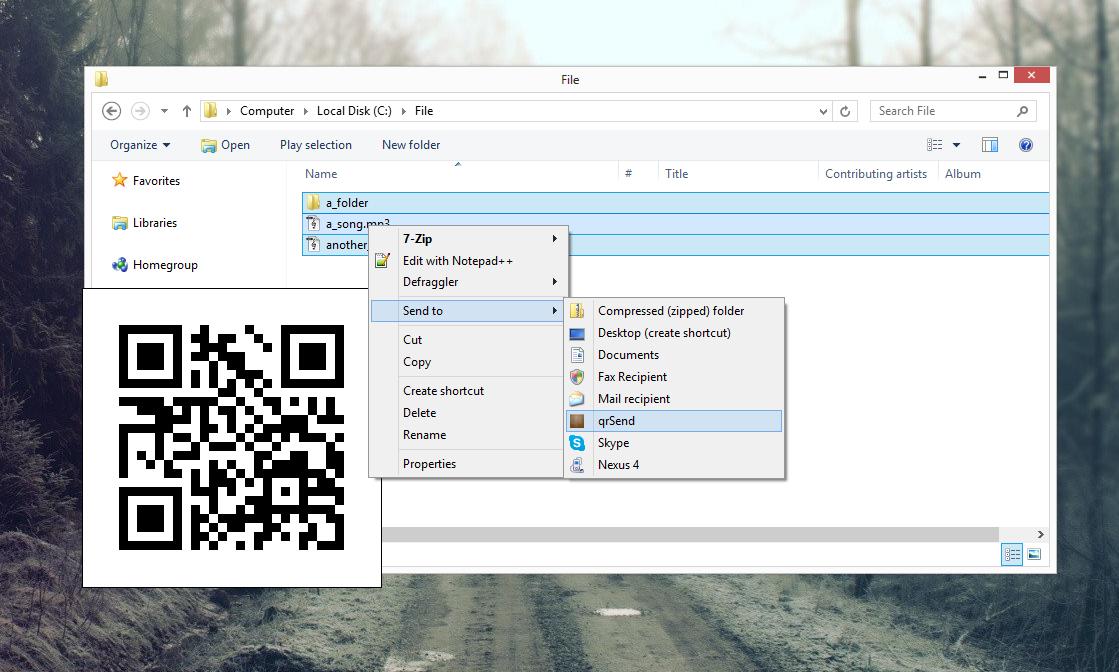 Windows Explorer 또는 OSX Finder의 파일 또는 폴더를 마우스 오른쪽 버튼으로 클릭하면 Send에서 Submenu로 " qrSend "를 선택한 다음 장치로 QR 코드를 스캔하면 파일이 클라우드 서비스 나 프록시 스토리지가없는 상태에서 휴대 전화로 직접 전송됩니다.
