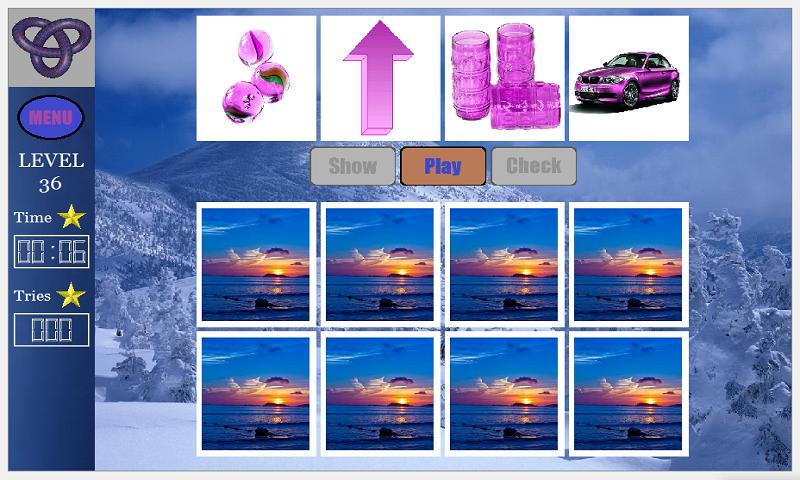 세트 찾기 -이 레벨은 시계가 똑딱 거리면서 플레이어가 메모리에 커밋 해야하는 작은 카드 세트를 보여줍니다. 플레이어가 준비가되었음을 나타내면 작은 세트가 얼굴 아래로 뒤집히고 더 큰 세트가 드러납니다. 그런 다음 플레이어는 원래 세트의 카드와 일치하는 모든 카드를 선택해야합니다.