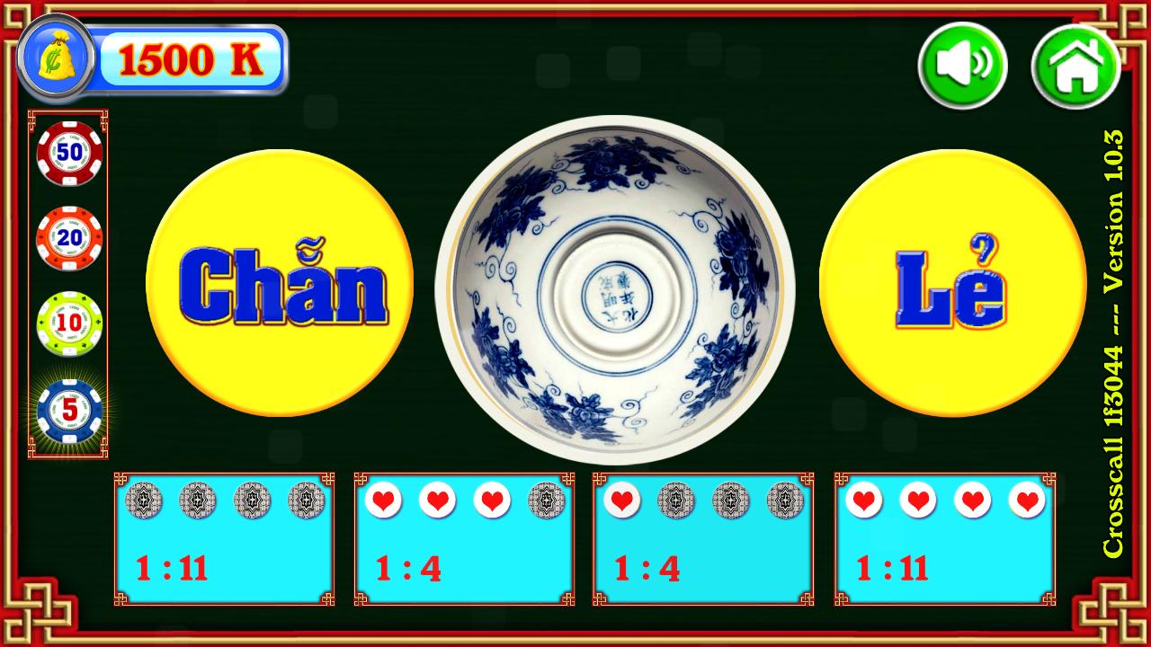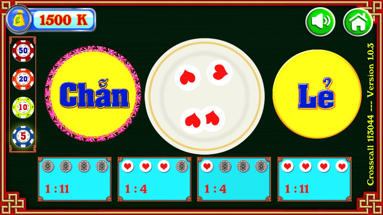 디스크 쇼크 게임은 베트남 민속 게임에서 조정 된 게임입니다. 게임의 내용은 매우 간단합니다. 단지 4 개의 객체 만 플레이트에 2 개의 차이가있는 4 개의 객체에 불과합니다. 반환 결과를 열 때 균일하거나 이상한 결과를 얻을 수 있습니다. 올바른 결과에 베팅하는 사람들은 이길 것입니다.