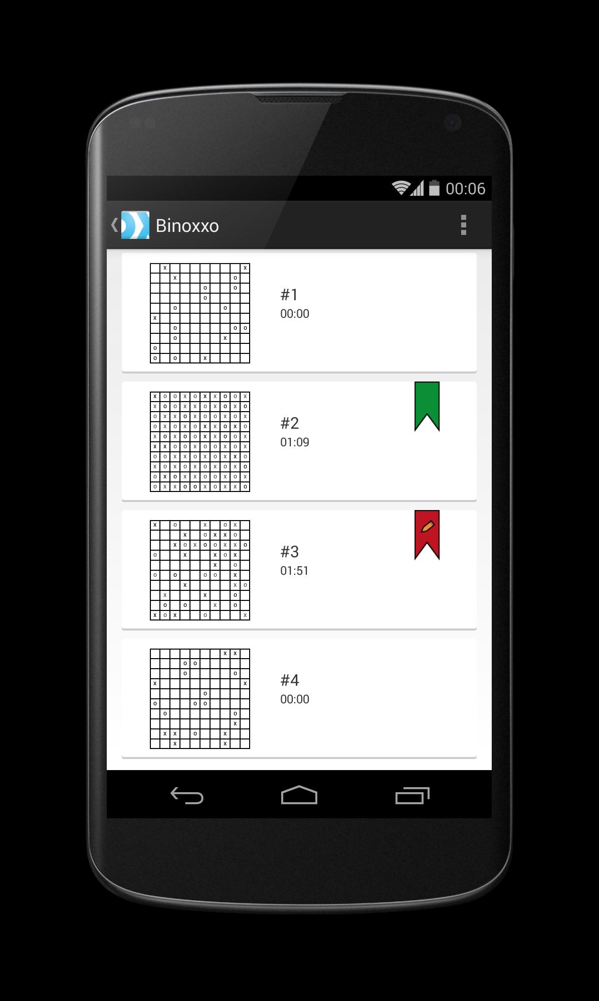 Takuzu, Tohu Wa Vohu, Binairo, Binary Puzzle 또는 Binary Sukok 쿠라고도하는 Binoxxo X와 O로 그리드를 채워야하는 게임입니다.