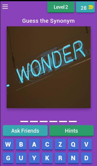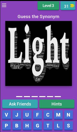 당신의 뇌 과열이 있습니까? :) 걱정하지 마십시오. Synonym Match 에서 우리는 플레이어가 올바른 편지를 표시하거나 잘못된 문자를 제거하거나 정답을 공개하는 등 플레이어가 다시 돌아 오는 데 도움이되는 몇 가지 방법을 제공합니다. 게임을 공유하여 동전을 얻을 수도 있습니다.