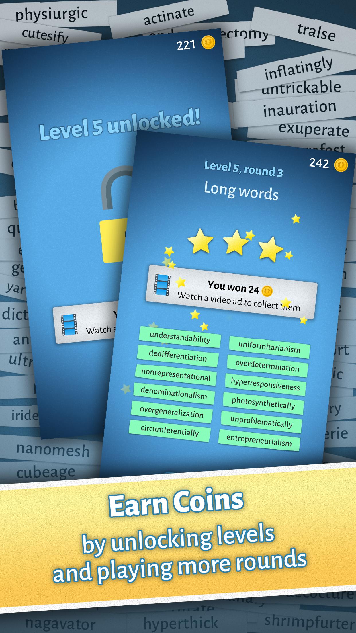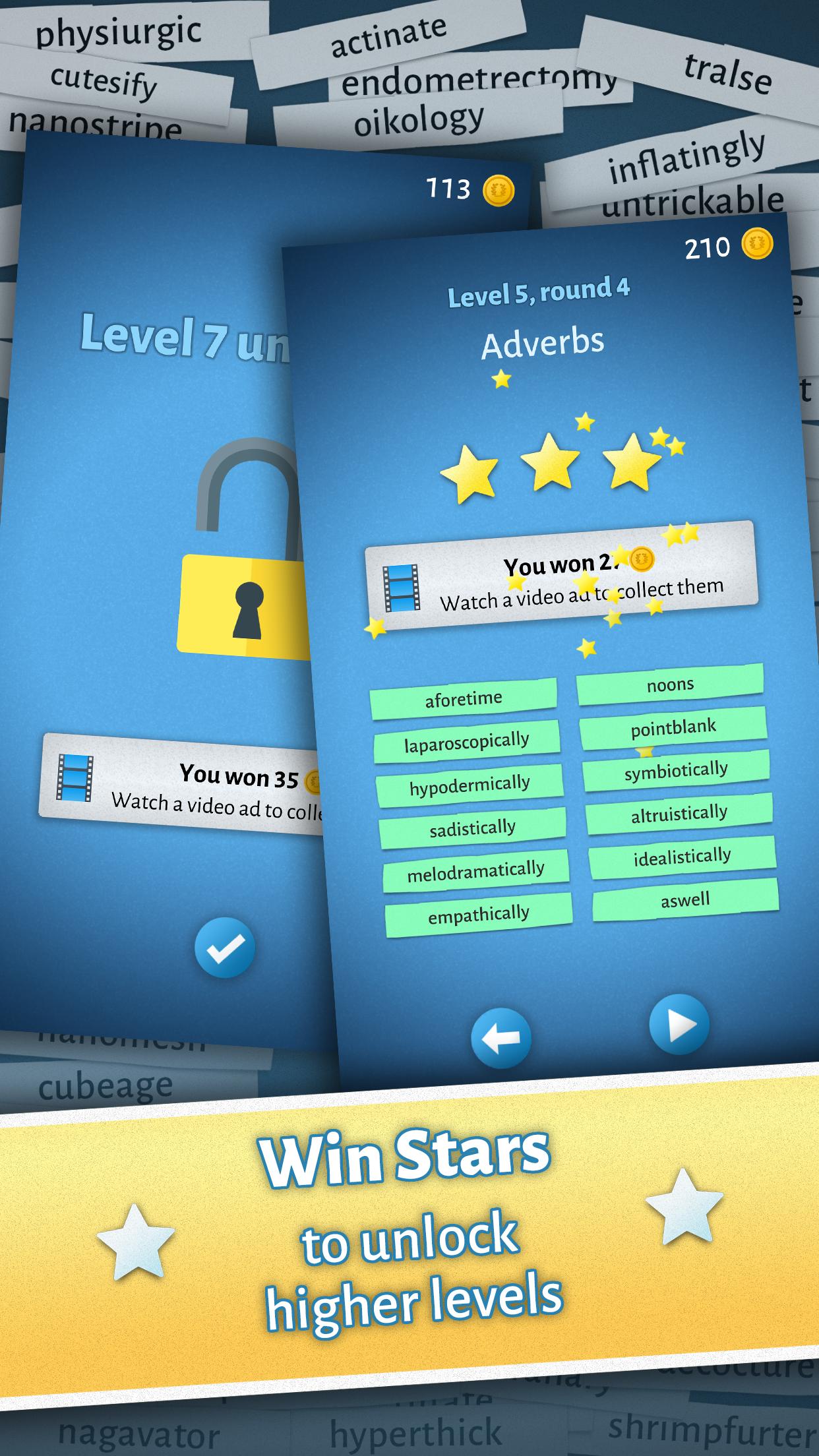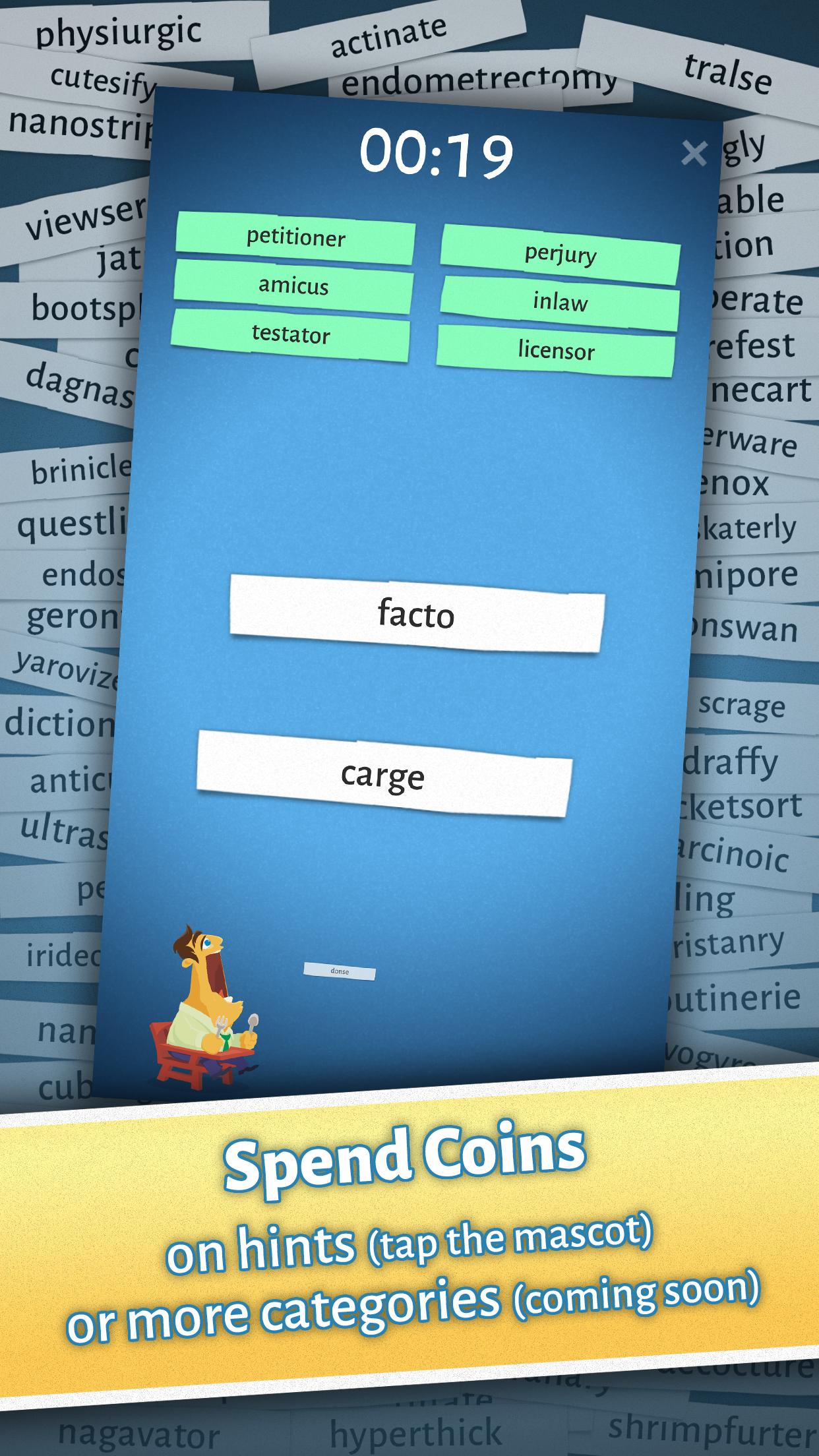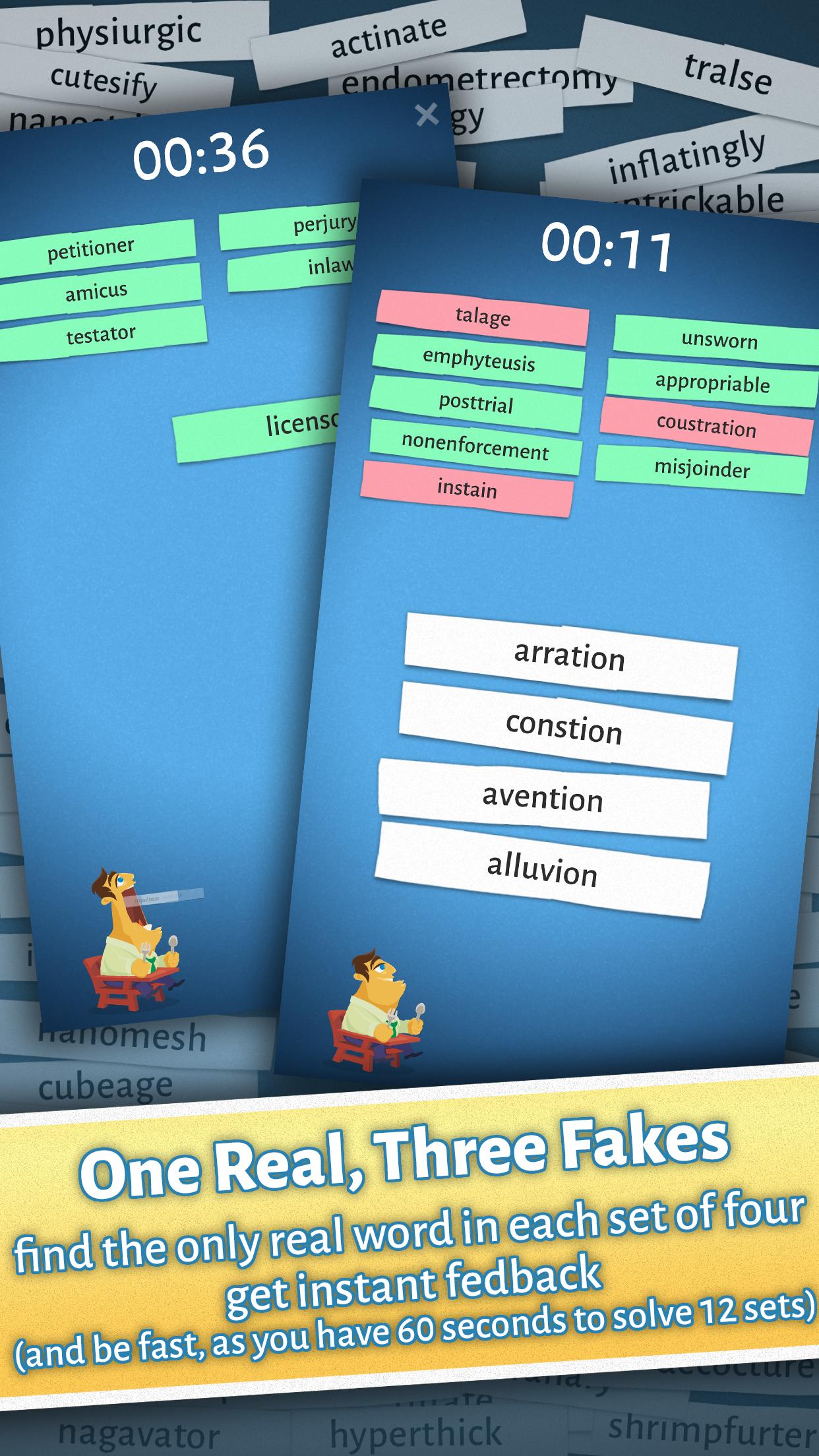 Verbivore는 네 단어의 세트, 즉 하나의 실제, 세 개의 가짜 세트를 제공합니다. 당신의 목표는 각 4 세트에서 실제 단어를 선택하는 것입니다. 12 세트의 라운드를 마친 후에는 단어의 의미를 배울 수 있으며 가짜 단어를 선택하면 실제 단어를 공개 할 수 있습니다. 단어는 법, 음악, 천문학 또는 수학 및 기타 여러 가지와 같은 주제 범주로 분류됩니다. 우리는 당신의 영어 능력의 한계를 극복 할 수있는 150 개 이상의 카테고리를 가지고 있습니다.