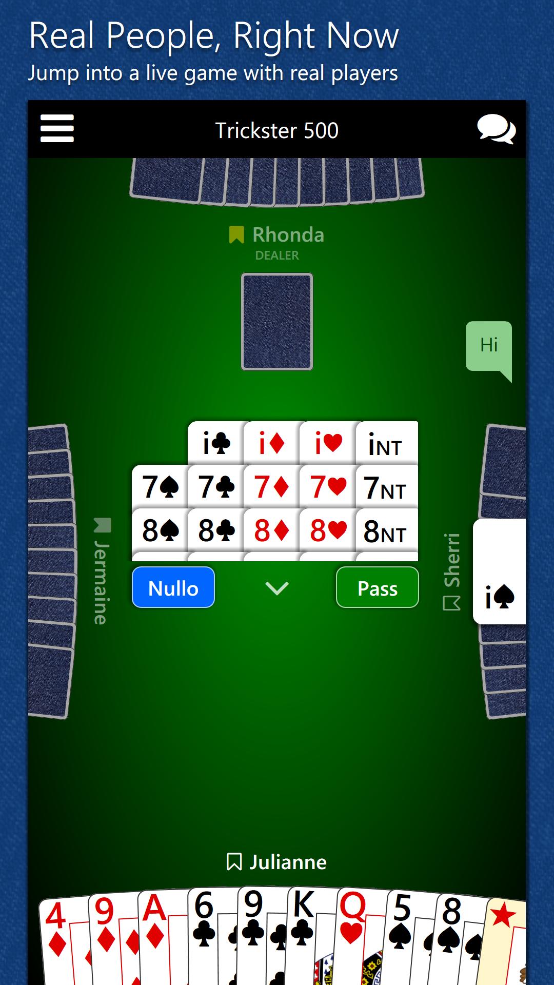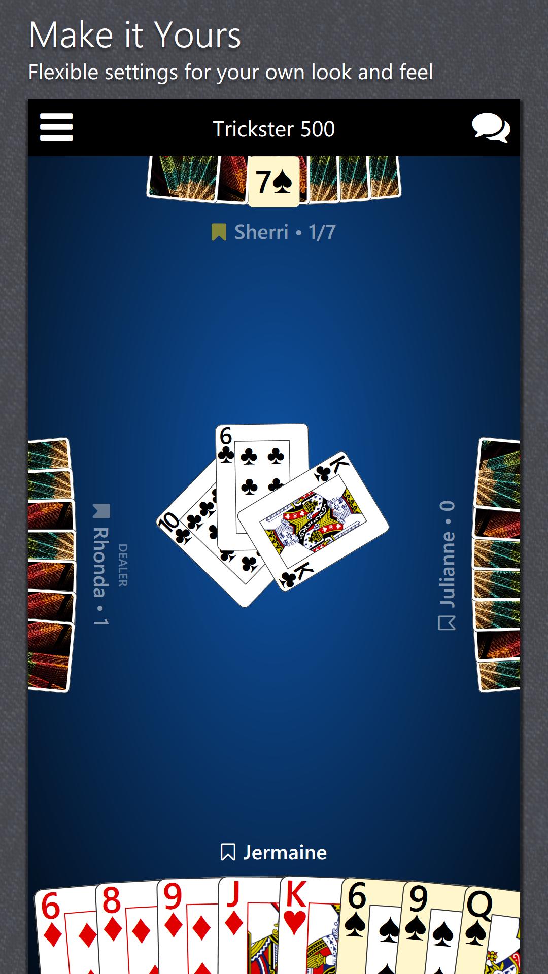 재미와 경쟁을 시작하게하십시오. 친구 및 가족과 좋아하는 게임을 플레이하거나 레벨에서 다른 라이브 플레이어와 어울리십시오. Trickster 500 사용자 정의 가능한 규칙을 제공하므로 500을 플레이 할 수 있습니다!