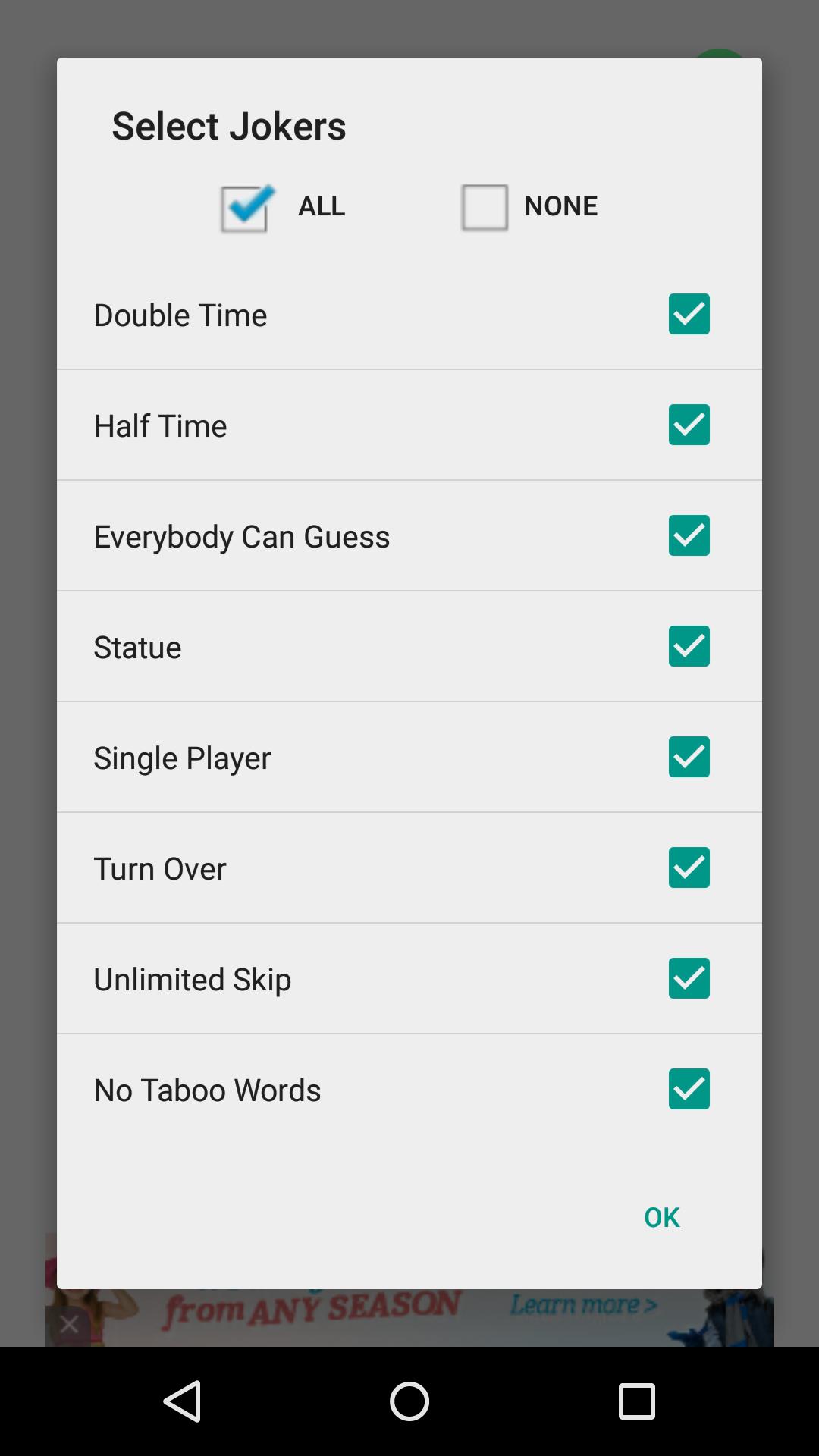 조커는 더 재미있게 만듭니다. 무제한 건너 뛰기, 모든 사람이 추측, 이중 시간, 반 시간, 동상, 한 선수, 금기 단어 없음 및 스킵 턴 조커는 당신이 가진 재미를 두 배로 늘릴 것입니다.