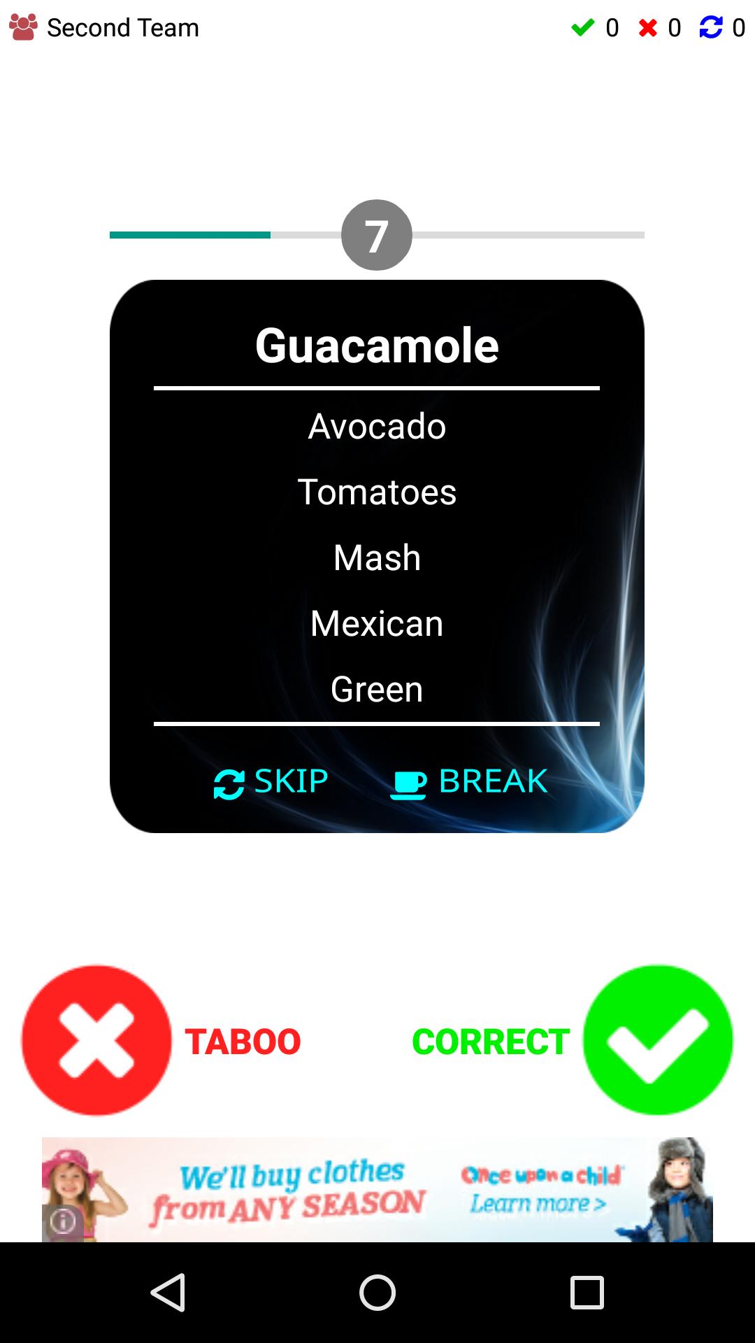 아래의 금기 사항 (금지 된) 단어를 사용하지 않고 팀원들이 맨 위에있는 단어를 추측하게해야합니다. 추가 규칙이 있습니다. 도움 섹션에서 모든 규칙을 읽는 것을 잊지 마십시오.