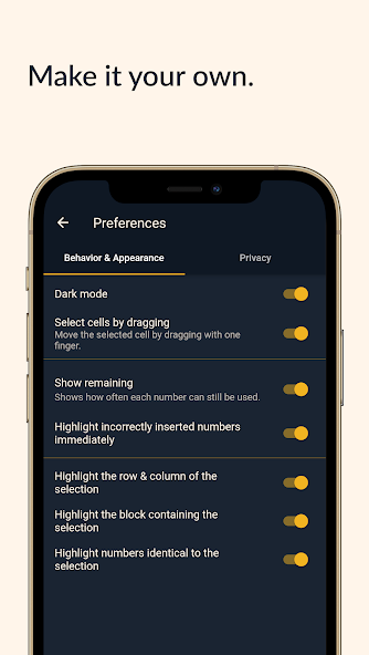 숙련 된 플레이어는 다양한 선호도 설정을 사용하여 자신의 경험을 좋아하는 경험을 조정할 수 있습니다. 연필 자국을 사용하여 더 어려운 스도쿠를 해결하고 모든 변화를 취소 할 수있는 것을 즐기십시오. 숫자를 배치하면 스마트 연필 자국이 자동으로 업데이트됩니다.