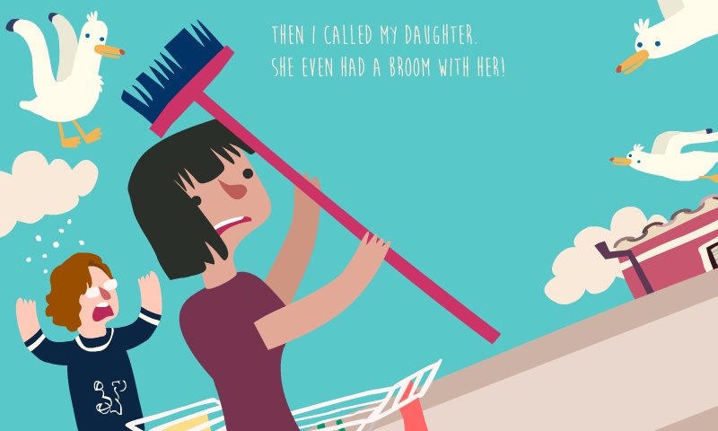 휴대폰을 왼쪽이나 오른쪽으로 기울여 딸을 움직여 보세요. 그에 따라 화면을 왼쪽이나 오른쪽으로 탭하세요. 갈매기들의 공격을 받기 전에 서둘러야 합니다! 우우!