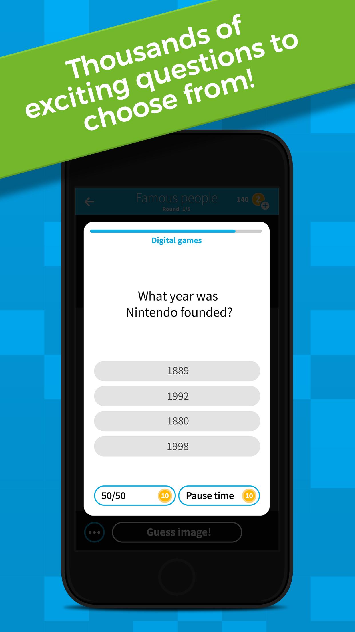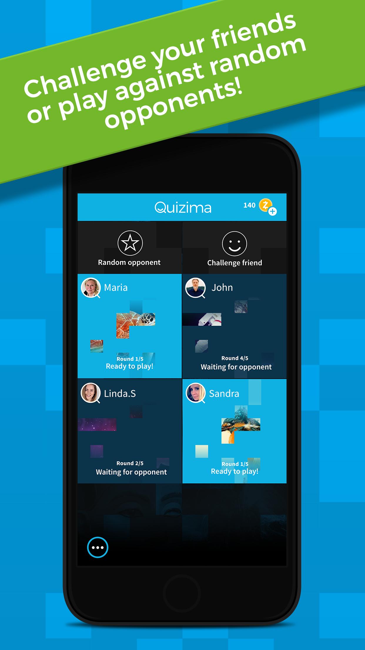 Quizima 퀴즈 질문에 올바르게 대답 할 때 비밀 이미지를 공개하겠습니다. 친구와 임의의 상대와 대결하여 누가 숨겨진 이미지를 인식 할 수 있는지 확인하십시오. 라운드 5의 끝에서 가장 높은 점수를받은 플레이어는 경기에서 승리합니다!