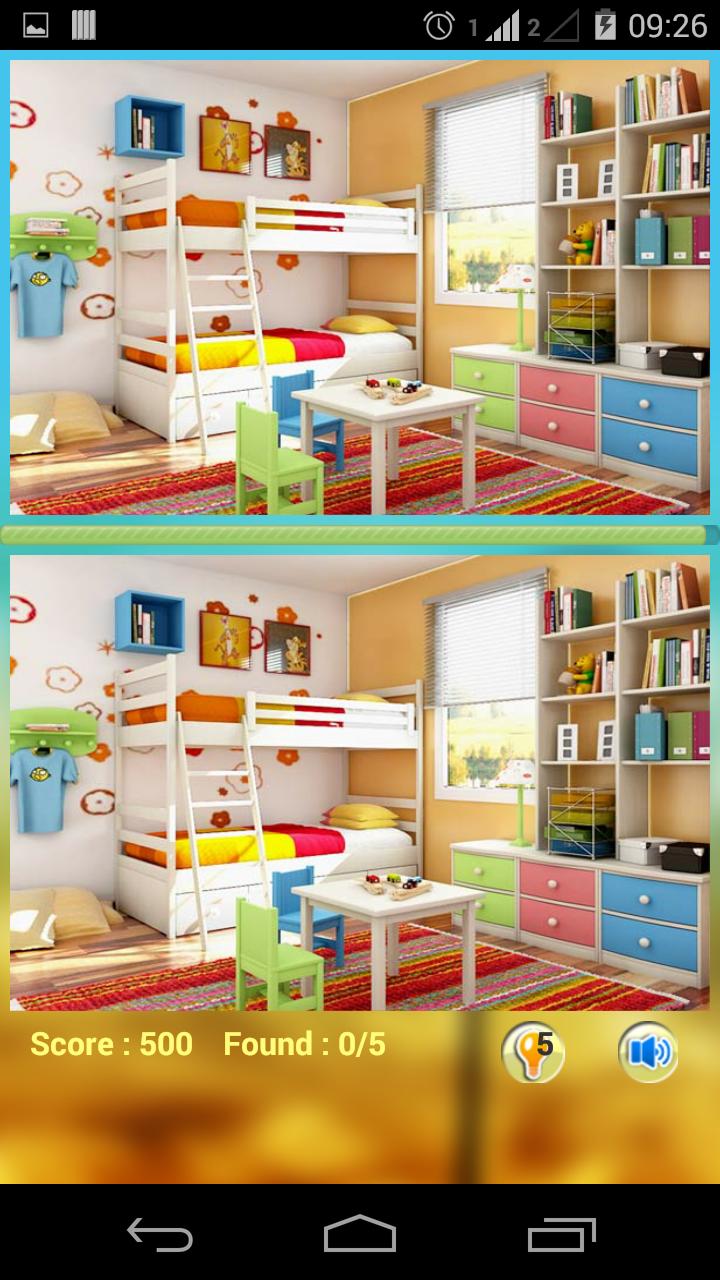 이것은 객실의 두 이미지 사이의 5 가지 차이점을 찾아야하는 "Bugs Game"으로 알려진 퍼즐 게임입니다. 목숨을 잃지 않고 시간이 다 떨어지기 전에 모든 것을 찾으십시오. 당신이 붙어 있다면, 당신을 도울 힌트 시스템이 있습니다!