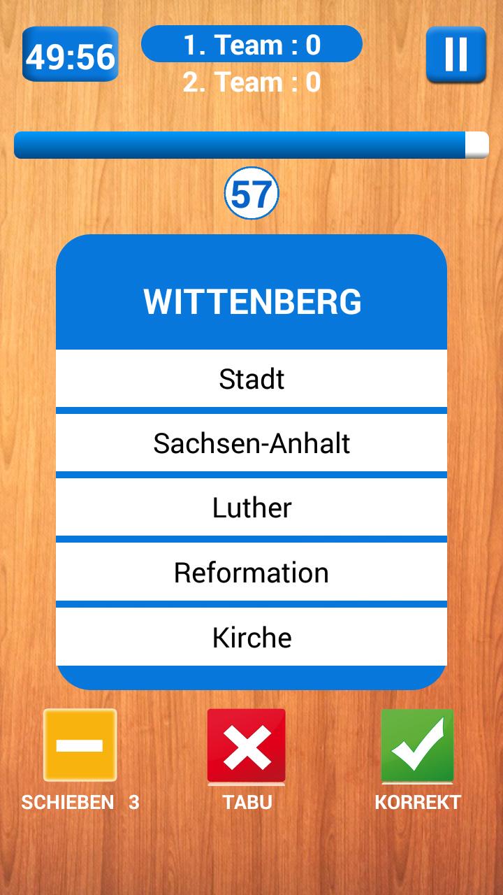 목표는 주어진 시간에 가능한 한 많은 세대의 팀을 설명하는 것입니다. 너무 많은 '금기'단어 (일반 용어 미만의 5 단어)를 사용할 수 없으며 게임 이름 'Tabu'를 제공했습니다. 상대 저택의 팀원은 설명이 '금기'단어를 사용하지 않도록해야합니다. 시간은 60 초입니다. 많은 추측과 연주!