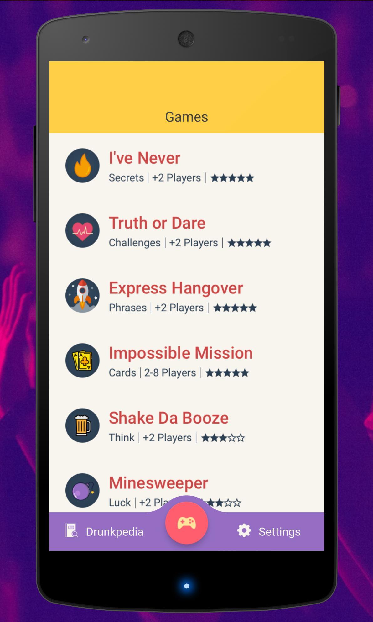 휴대 전화에서 많은 음주 게임을 즐기십시오. 항상 당신과 함께하고 파티에 데려 갈 수 있습니다. 파티맨의 스위스 칼을 얻으십시오! Dices, Card 및 기타 여러 유형의 게임을 찾을 수 있으며 최대 8 명의 친구와 함께 플레이 할 수 있습니다! 그리고 섹션 Drunkpedia를 사용하면 전 세계의 많은 음주 게임의 규칙을 알 수 있습니다.