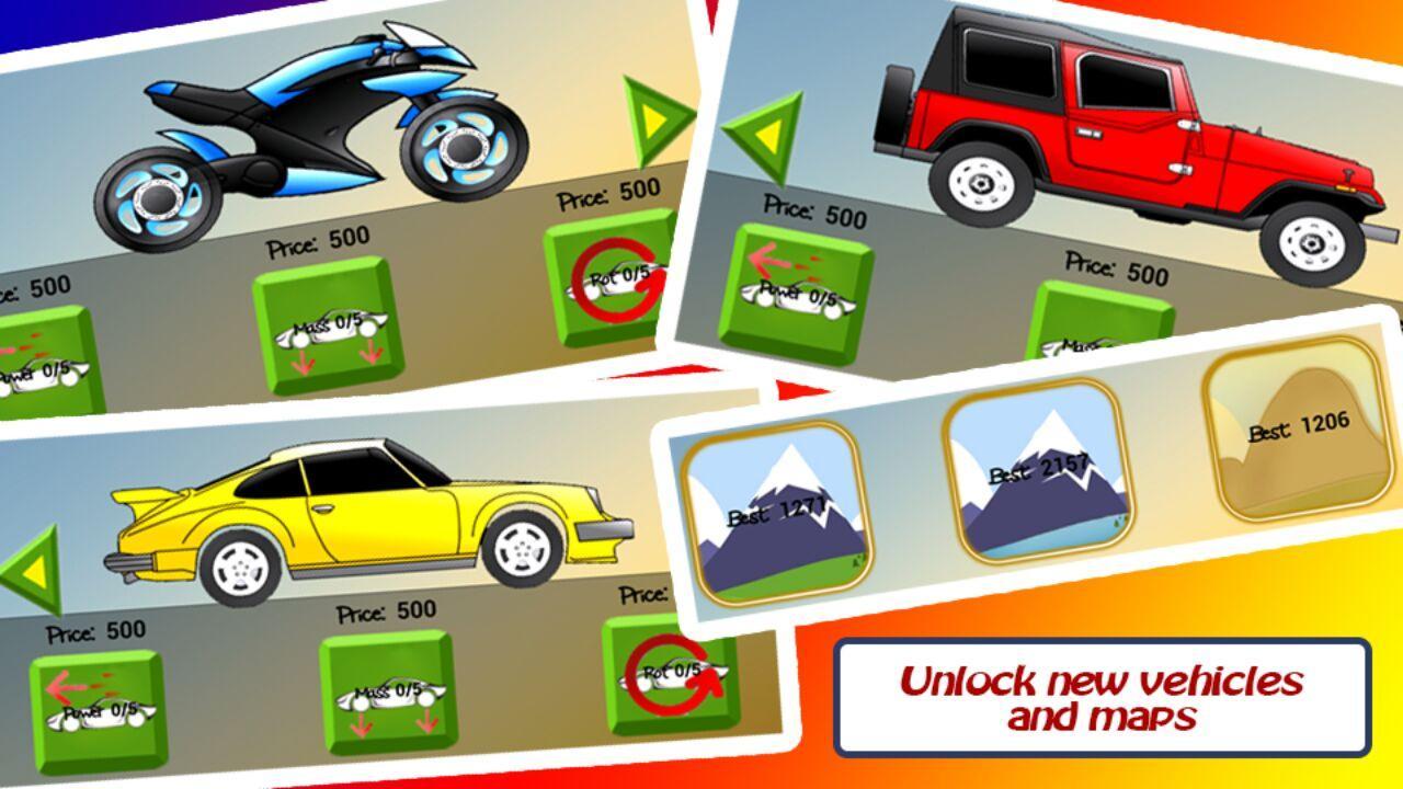 Crazy Hill Race 2015 안드로이드 폰이나 태블릿에서 플레이 할 수있는 간단하면서도 매우 흥미로운 게임입니다. 이 물리학 기반 언덕 등반 경주 게임이 당신의 관심을 끌고 여가 시간을 모두 먹으며 결코 놓지 않을 것이기 때문에이 게임의 매우 중독성있는 특성을 조심하십시오! 자신과 친구들이 플레이하여 잠금을 해제 할 수있는 다양한 자동차와 무대에서 최고의 점수를 얻기 위해 경쟁하는 데 도전하십시오. 당신의 길에 흩어져있는 동전을 모으고, 미친 점프와 트릭을 한 다음, 돈을 사용하여 타는 것을 속이고 더 나아가십시오.