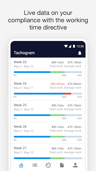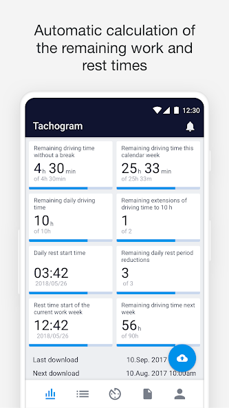 Tachogram calcula automaticamente o tempo de trabalho restante, levando em consideração todos os aspectos dos regulamentos da CE. Siga o tempo de condução restante, os horários de descanso diários e semanais.