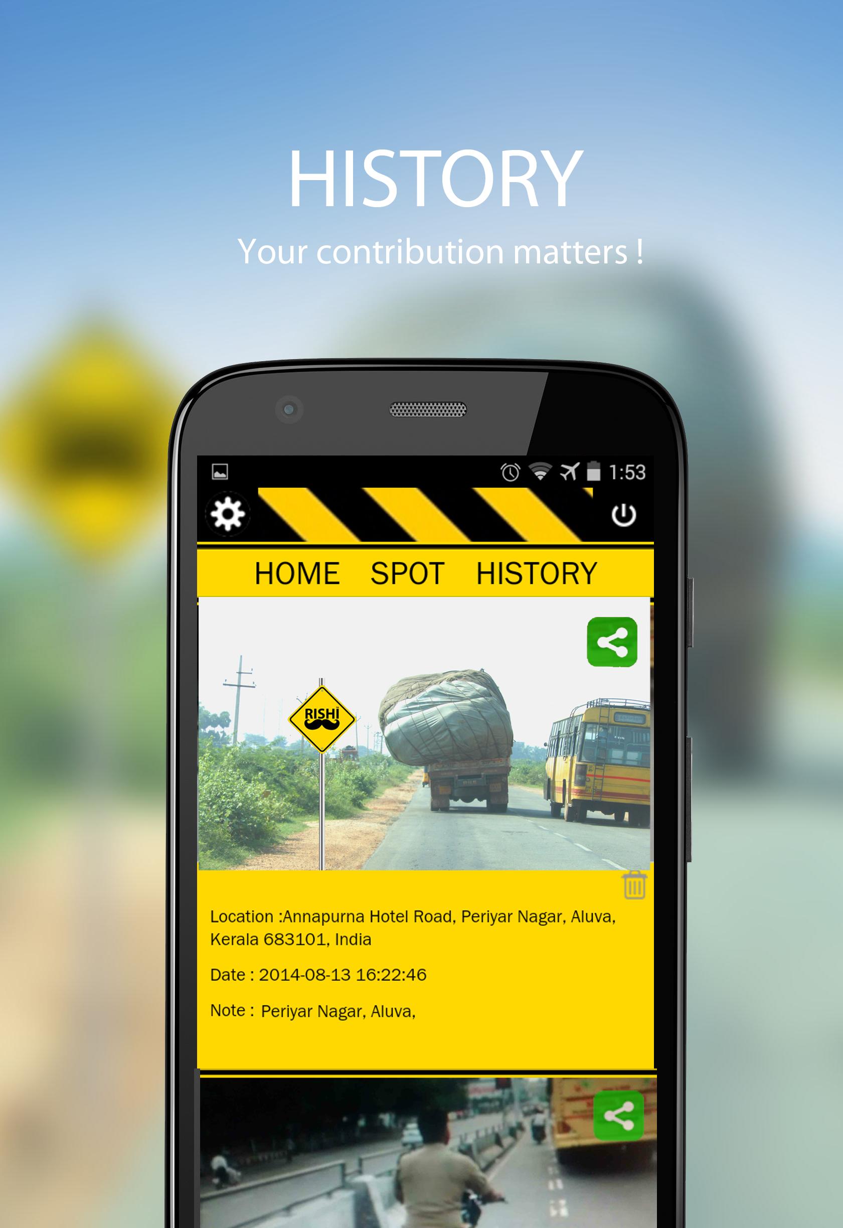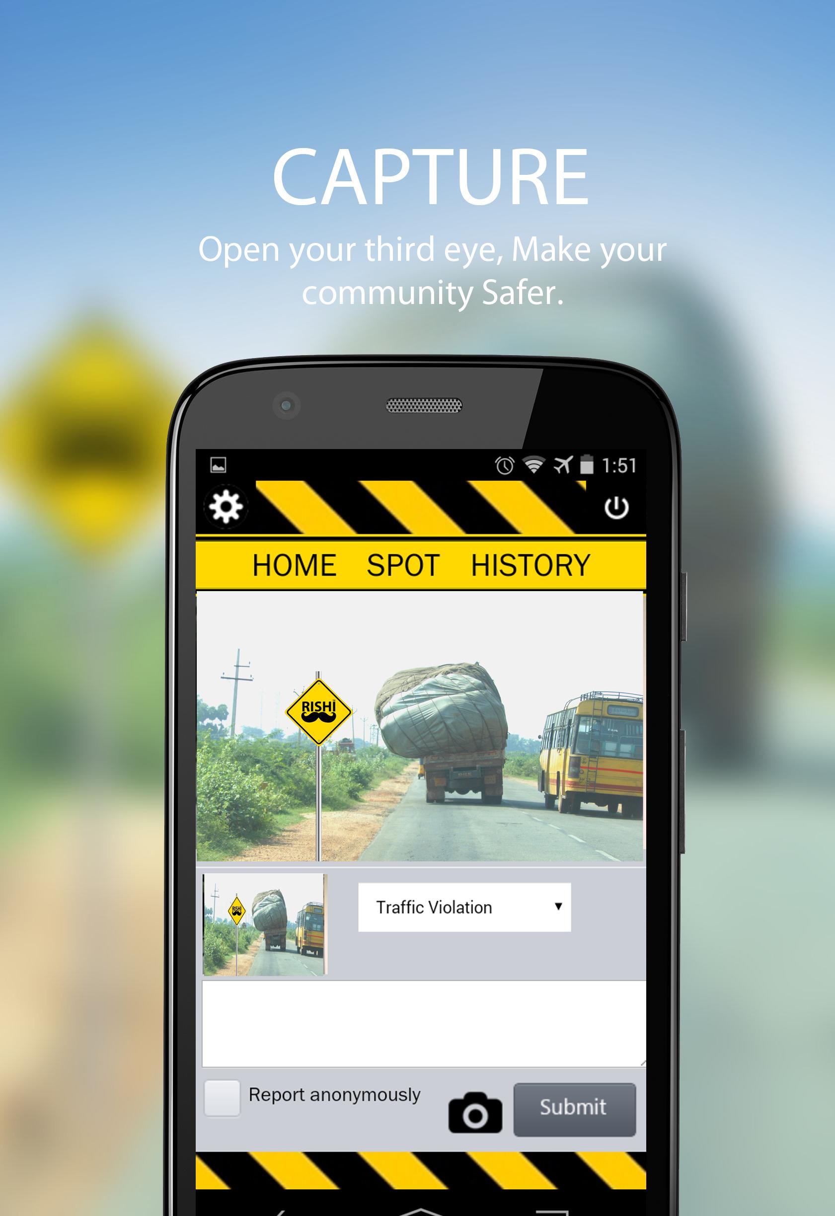 RISHI SPOT é um aplicativo móvel que ajuda as pessoas a denunciar violações de trânsito em tempo real, simplesmente tirando uma foto ou vídeo do incidente. O aplicativo envia os dados junto com a localização do incidente usando a data e a hora do GPS do incidente para a autoridade de trânsito mais próxima com a permissão do usuário anonimamente ou explicitamente. É uma tentativa de envolver ativamente a comunidade para fazer cumprir as leis de trânsito para tornar nossas estradas mais seguras uma cidade de cada vez. Daí "juntos, para estradas mais seguras".