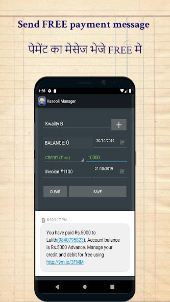 Vasooli Manager é o seu aplicativo de livro digital udhar bahi Khata, onde você pode fazer vendas a crédito, obter contas de débito e crédito de saldo de teste e enviar mensagens educadas de lembrete de pagamento vencido (SMS) para seus clientes. É como um Tally simples e seguro para dispositivos móveis . É um software de contabilidade empresarial simples usado por proprietários de pequenas e médias empresas para manter transações de crédito (Jama) e débito (Udhar) das contas contábeis de seus clientes. É o aplicativo vyapar nº 1 para coletar hafta vasuli em negócios de atacado usando a geração de relatórios onde o proprietário pode ver o crédito total, débito e pesquisa do histórico de transações, data e área.