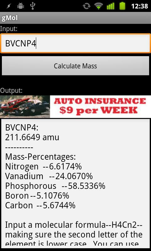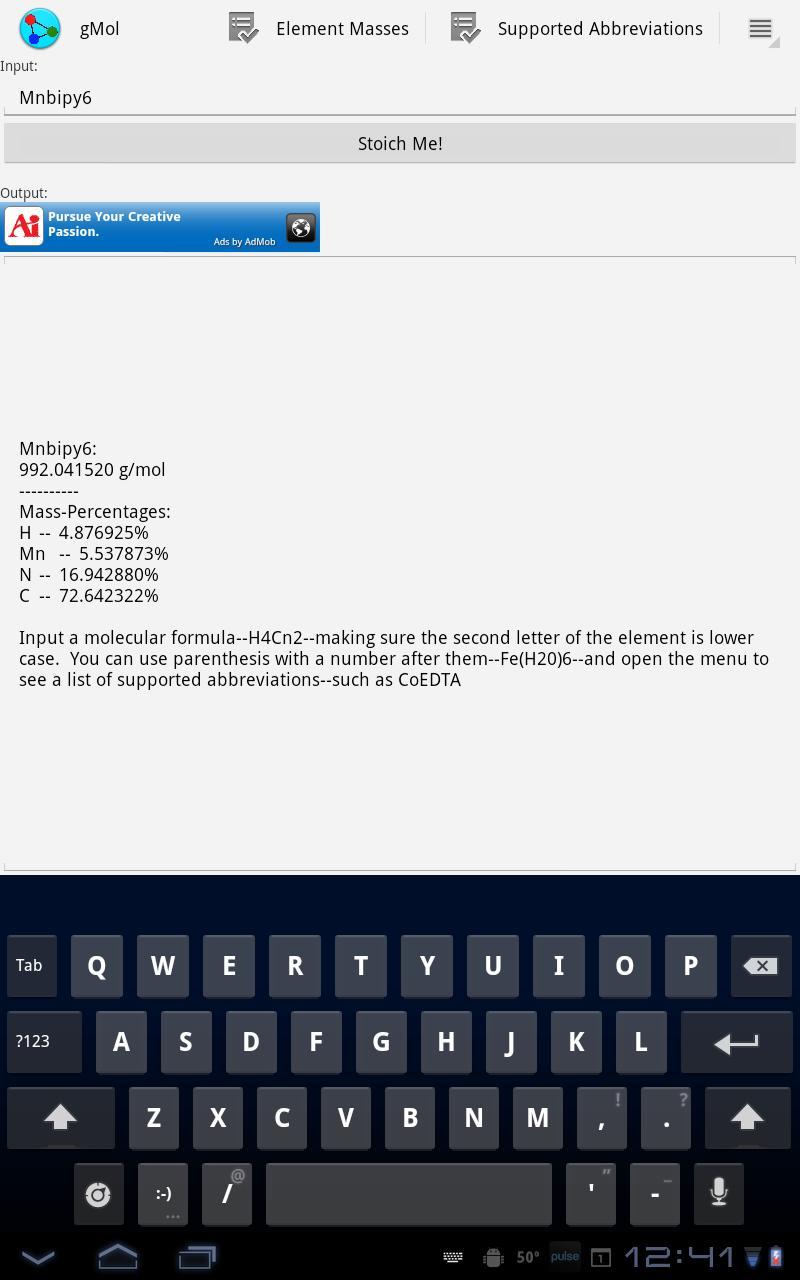 Ótima alternativa a uma mesa periódica e um lápis. O GMOL calculará a massa molar (massa atômica) e porcentagens de massa elementar a partir de uma fórmula química digitada. Handy para estequiometria no ensino médio, AP, química da faculdade ou universidade, biologia ou (talvez até) aulas de física ou pesquisa. Espero que você ache útil!