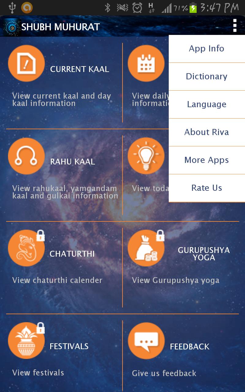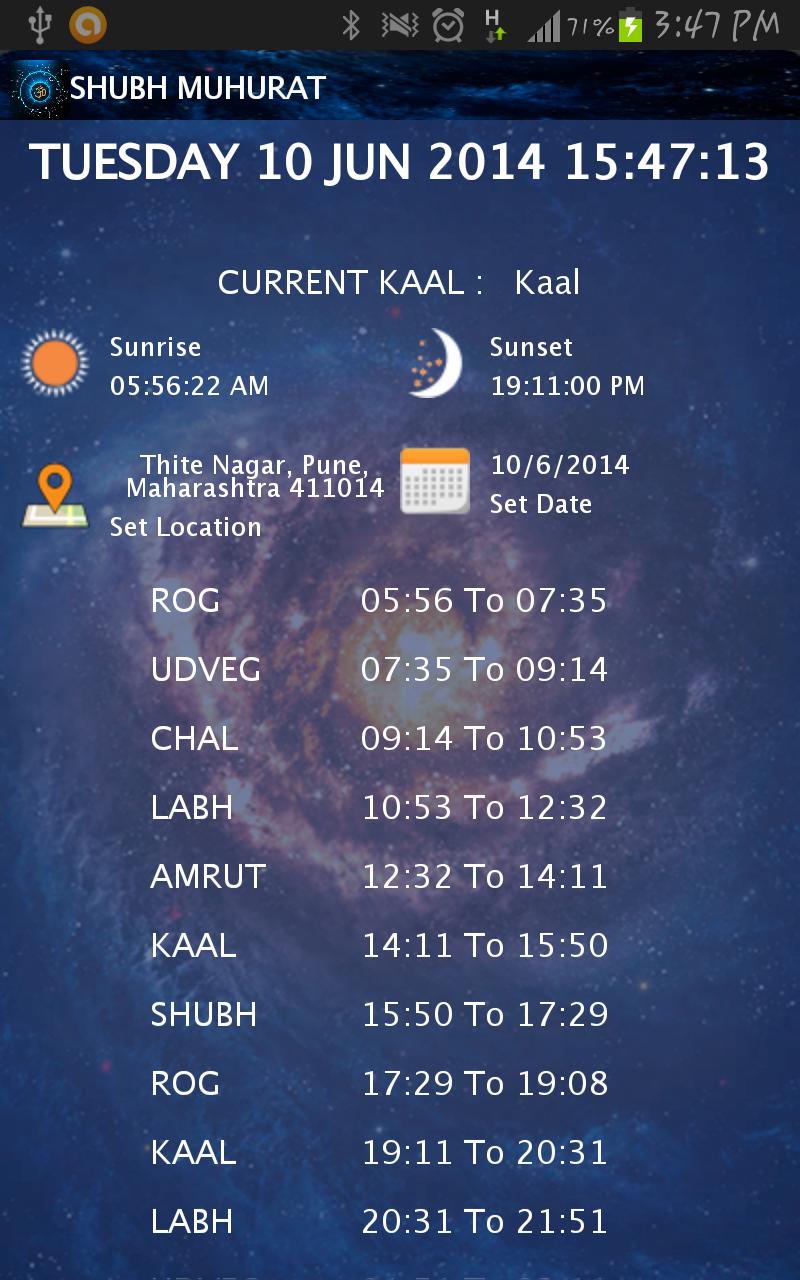 Shubh Muhurat é um aplicativo inteligente que detecta o local atual e o fuso horário do usuário para gerar automaticamente o choghadiya da sua localização em uma data selecionada.