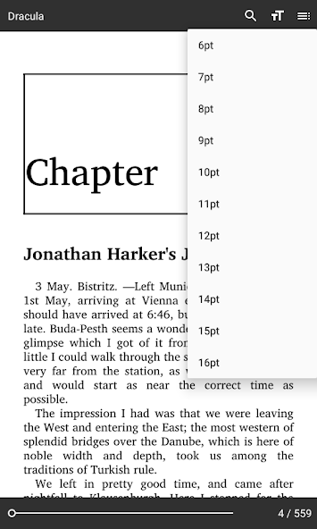 A barra de ferramentas também possui um botão de pesquisa, um botão de tamanho de texto (para definir o tamanho do texto nos documentos EPUB e FB2), um botão de zoom (para alternar entre a página de ajuste e o ajuste da largura nos documentos PDF) e um botão de tabela de teatro.