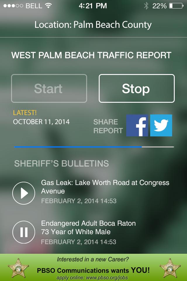 Início aplicativo Leitura de informações Audio Traffic Palm Beach