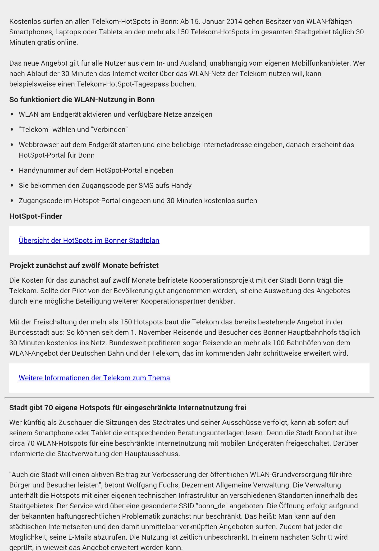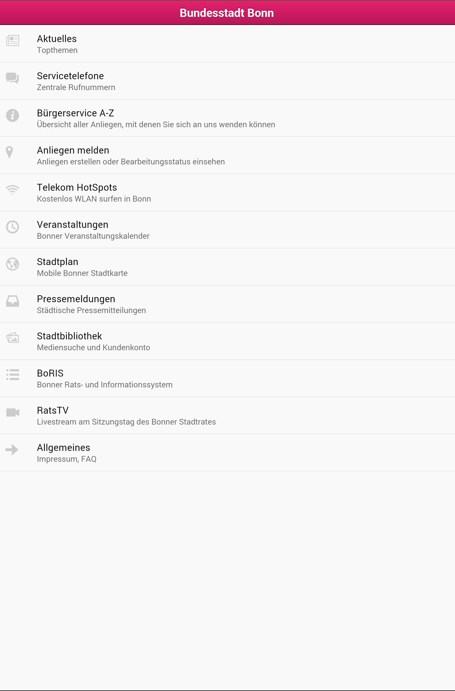 O Bonn Ratstv é mostrado pela primeira vez em todo o país em um aplicativo municipal. O debate político na transmissão ao vivo pode ser seguido no dia da reunião do Conselho da Cidade de Bonn. (Observe: Observe que quantidades maiores de dados serão chamadas em uma transmissão ao vivo da reunião do conselho. Portanto, recomendamos que usamos apenas a transmissão ao vivo com um acesso à WLAN.) A matéria impressa pública associada dos órgãos do Conselho da Cidade também pode ser vista no aplicativo. A administração da cidade continua a expandir as opções de comunicação móvel e as atividades de governança aberta.