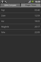 Tempos de oração, distância e direção (apontados pela flecha) para Kaaba em Meca. É preciso a diferença entre o norte magnético e o verdadeiro norte em consideração.