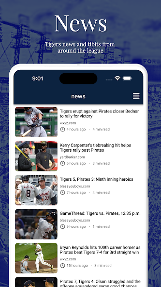 Siga a equipe de Michigan com Detroit Baseball , um aplicativo não oficial sobre o Detroit Tigers. Simplificando, com notícias e opiniões dos Tigres, pontuações ao vivo, cronograma de equipes, estatísticas de jogadores e classificação da MLB. Enquanto verificamos o que está acontecendo em torno do beisebol e dos menores, nos concentramos nos tigres.