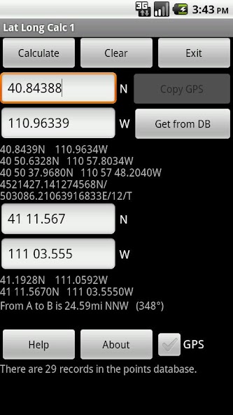 Lat Long Calc é uma ferramenta GPS que converte coordenadas de latitude/longitude em diferentes formatos e calcula a distância e a direção entre dois pontos. Esta é a versão gratuita. Para mais recursos, procure Lat Long Calc Pro.