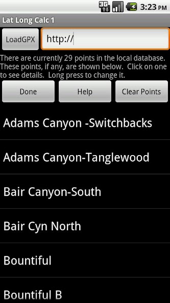 Suporta DD.DDD, DD MM.MMM, DD MM SS.SSS, UTM e Maidenhead Locator. Pode carregar pontos de um GPX e/ou salvar pontos no banco de dados local para uso posterior.