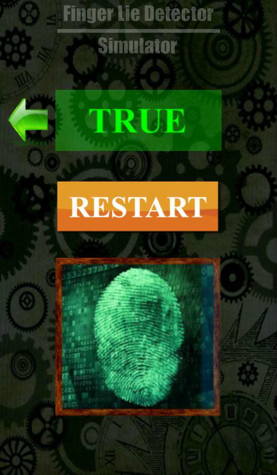 Com este jogo, você pode surpreender seus amigos. Você acha que seus entes queridos têm algo a esconder de você? Esta simulação do polígrafo. Pareça um detetive. Pergunte ao seu amigo que há muito tempo quis aprender, então ele deve colocar um dedo no scanner e a resposta - e o programa resultará - verdadeiro ou falso. Mas não se esqueça que isso é apenas uma piada.