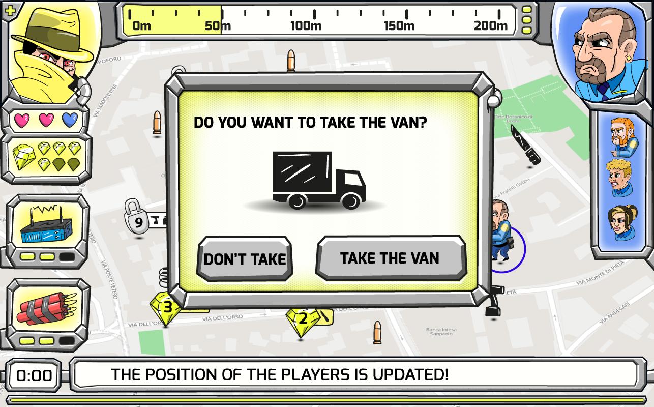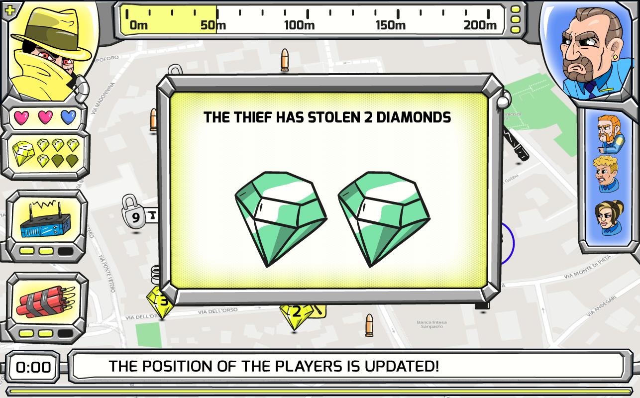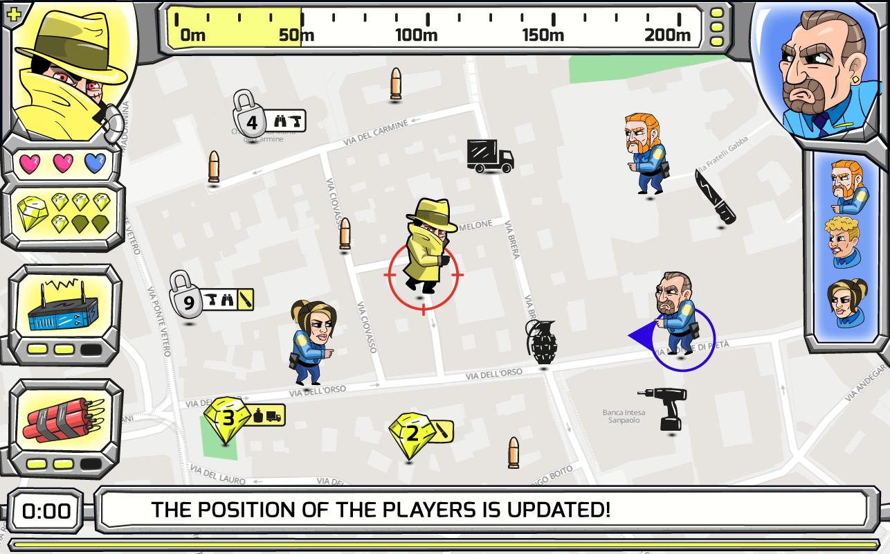 Como gangster, você pode soltar explosivos ou enganar seus perseguidores. Como policial, você pode trabalhar em conjunto com outras pessoas para atirar no gângster!