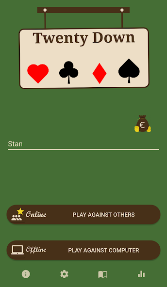 O jogo de cartas Twenty Down é jogado com um conjunto único/duplo de cartas francesas ou da Baviera. Cada jogador inicia um jogo com 20 pontos e termina assim que um jogador atingiu ou até prejudica 0 pontos. Jogador que chega 0 primeiro, vence o jogo. Assim, todo truque conta um ponto. Se o Hearts foi determinado como Trump, todo truque conta dois pontos.
