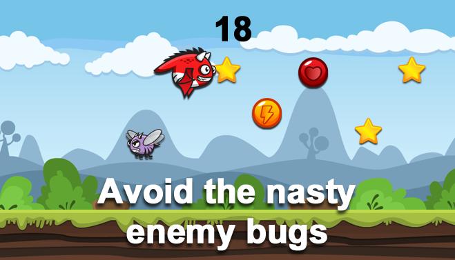 Toque na tela para fazer o Red Dragon voar. Pegue todas as estrelas e power ups e evite os insetos.
