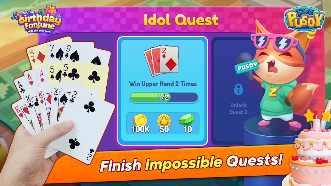 Avançar suas habilidades com a série de missões de ídolos. Termine todos eles, desde o mais fácil - Jogue 1 partida - até o mais difícil, Pusoy todos os oponentes. Complete para obter ouro extra e continuar jogando.