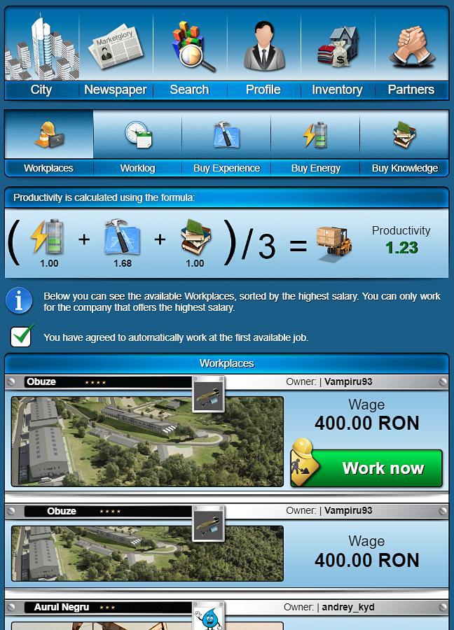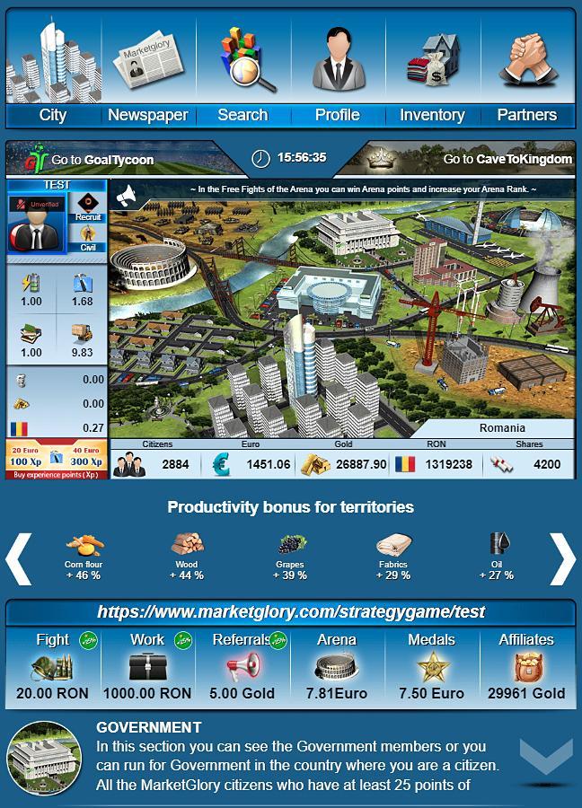MarketGlory é um jogo de navegador on -line em massa, no qual toda a tração virtual pode ser trocada em dinheiro real. É um simulador econômico, político, social e militar, onde você pode usar sua moeda local em seu benefício. Cada jogador da Comunidade MarketGlory tem a oportunidade de: trabalhar, montar empresas, concorrer ao governo, recomendar referências, ganhar fileiras militares e construir sua própria organização.