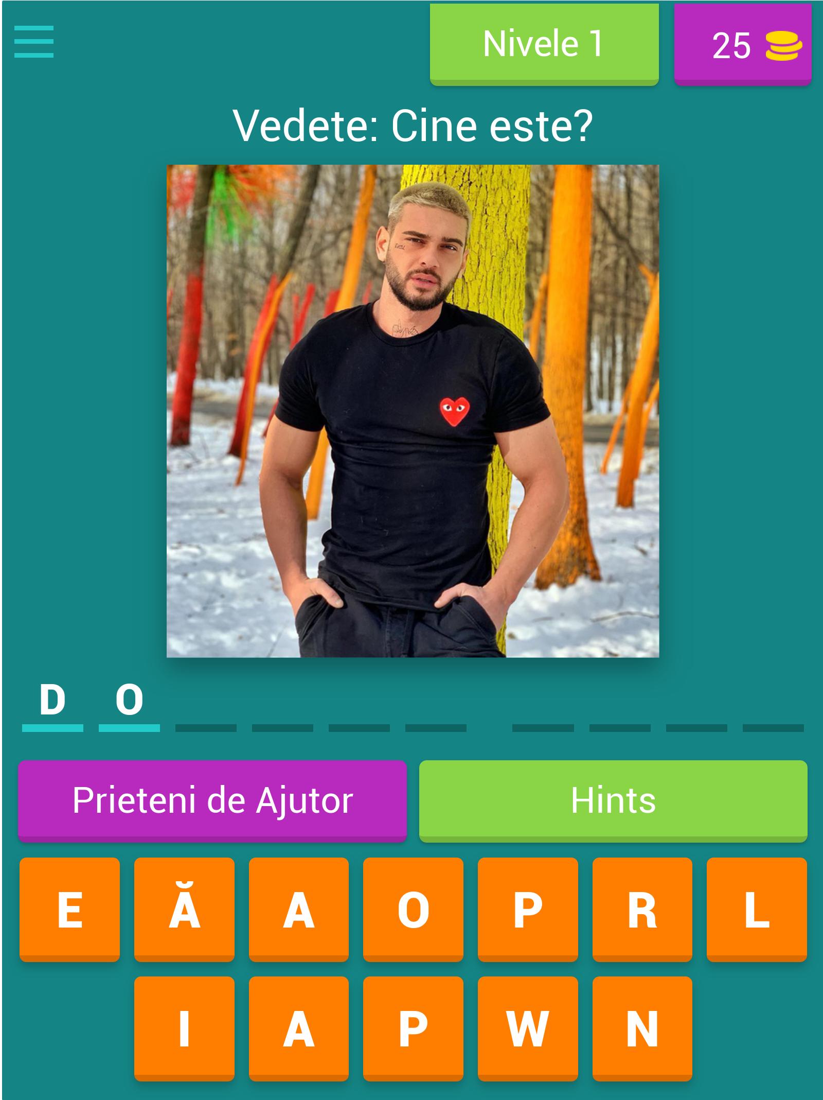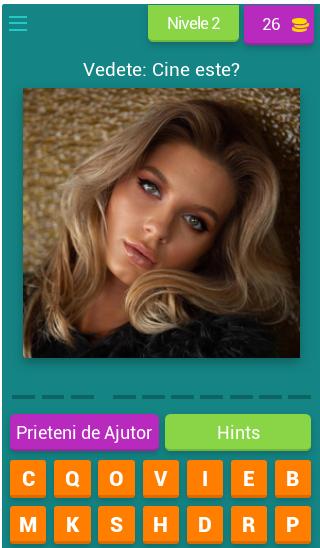 Acho que a estrela na Romênia! Inicie o teste agora e veja se você pode passar os 40 níveis que preparei. Se você perceber quem está em cena, então você é um enigma muito bom e, para isso, em breve terá mais aplicativos como (mesmo com estrelas distorcidas ou por que não, por exemplo, com carros, celebridades de outros países).